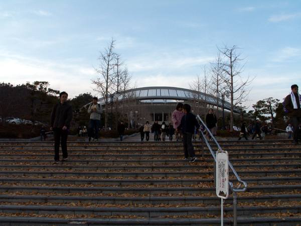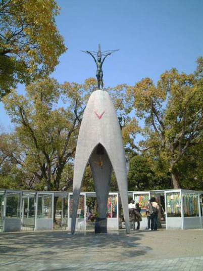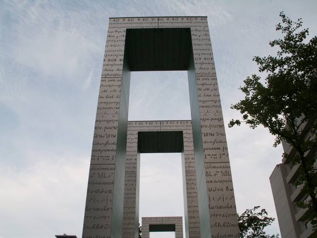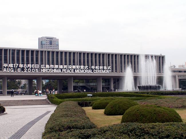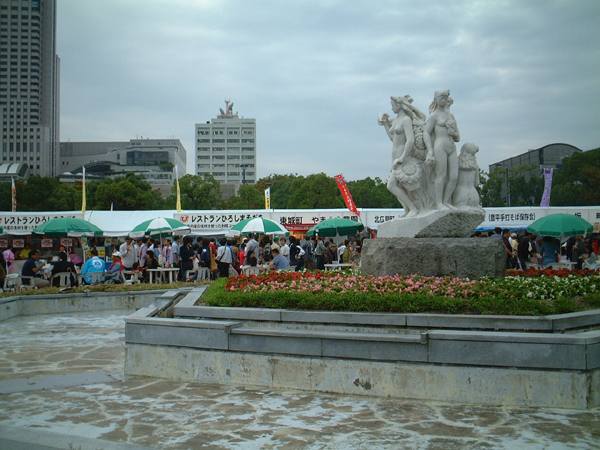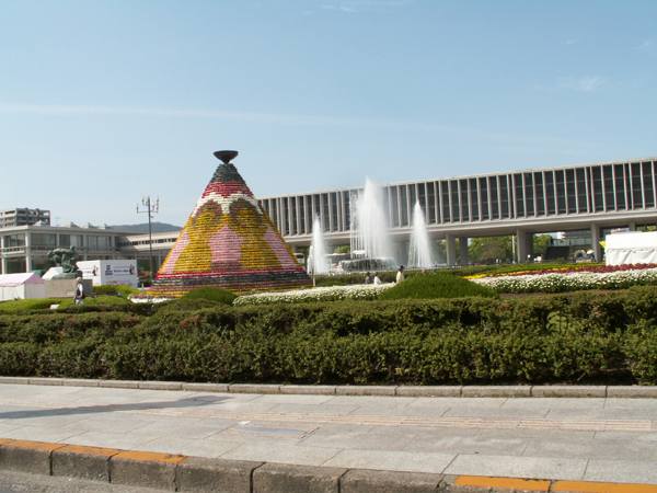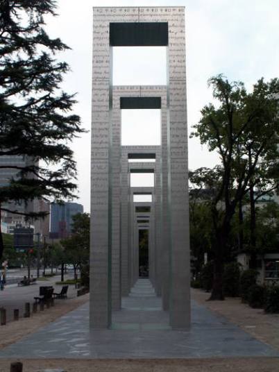| 噴水と西館 | 原爆ドーム、平和の灯、記念碑、噴水は、一直線上に並んでいます。 | 新しく出来たモニュメントです。ガラスに世界の49の言語で「平和」の文字が刻まれています。高さ約9メートル、幅約2.6メートルの門が10基あります。 | ||