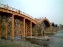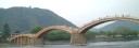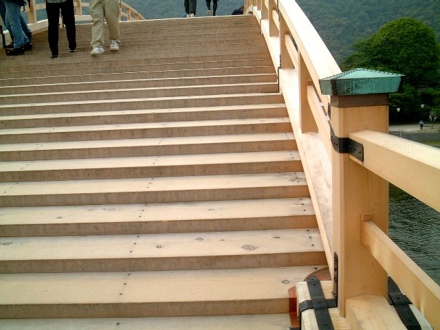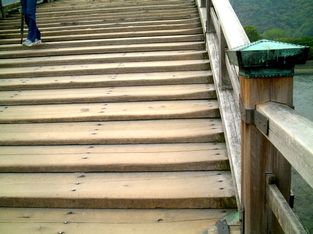 2003/ 4/28 ティラリ〜♪・・・ダバダ〜ダバダ〜♪違いのわかる男「錦織健」のあのコマーシャル 橋の上で思い出してしまうのは、決して私だけではないはず・・・。 日本三大名橋の一つで、釘は1本も使われず、 複雑な多くのカスガイと巻金で組み立てられています。(組木技法) 現在、架け替え工事中という事で見に行きました。 ちなみに、三大名橋の他の二橋は、東京の日本橋と、長崎の眼鏡橋です。