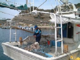 | 網の手入れをしていたおじちゃん。 沖に出て底引き網で漁をするんだって。 多分、この船がここで一番大きな船です。 撮影許可も、ちゃんといただきました。 |
