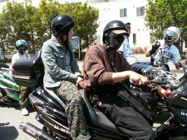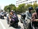| 途中大渋滞 隣を走っていたスクーター野郎たち。 60台以上の大群で圧巻でした。写しても良いか聞いたら ご機嫌でポーズを決めてくれました。 |