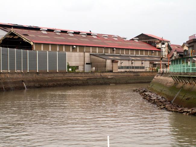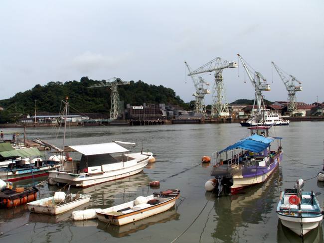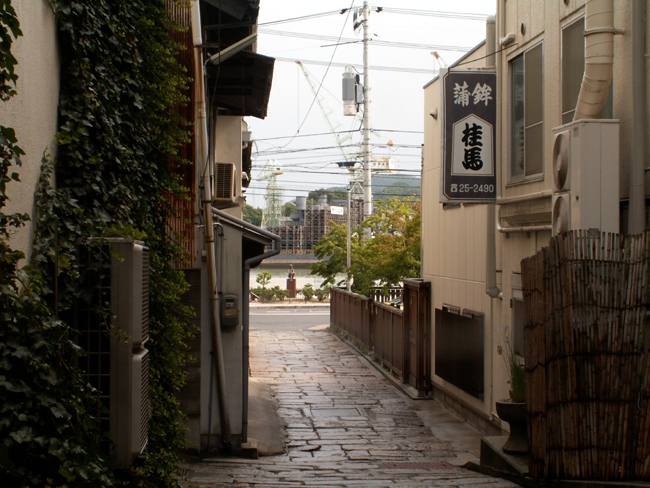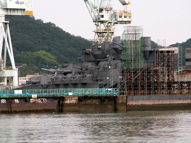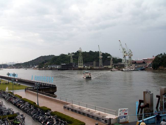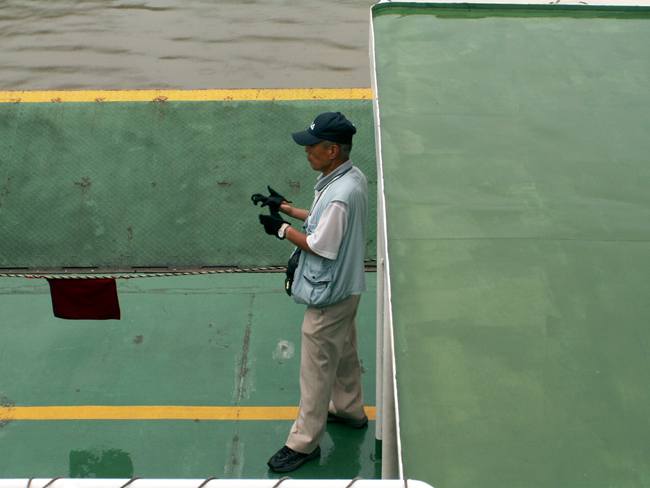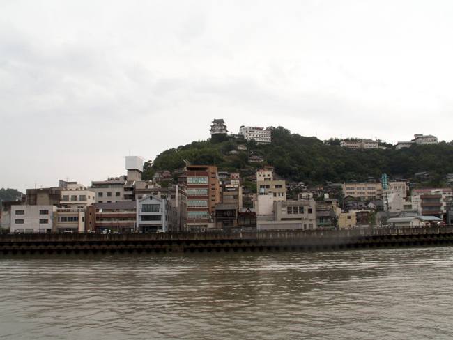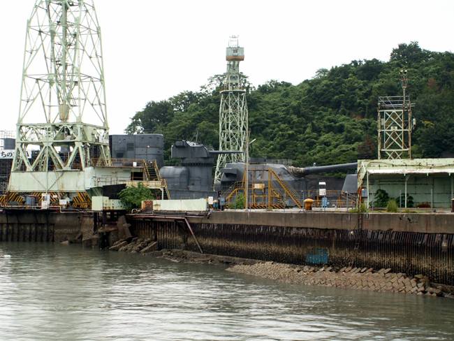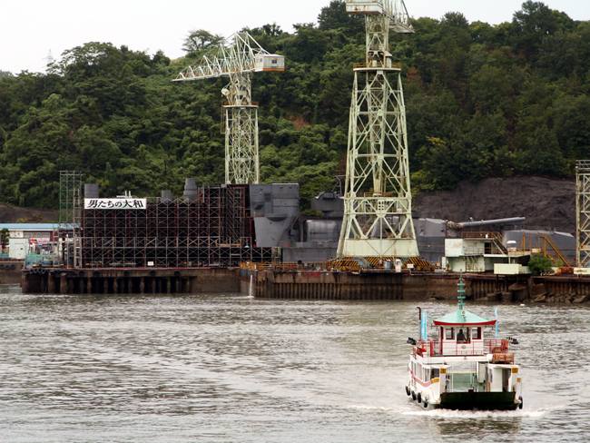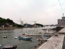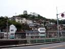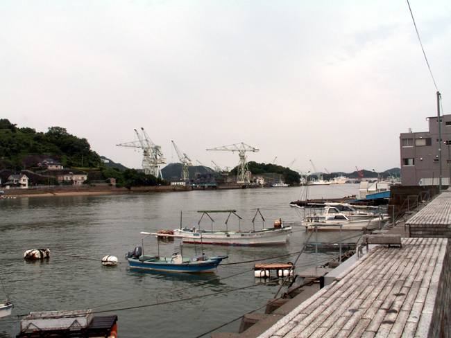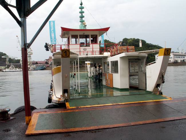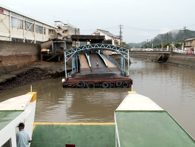 | 実は予定では向島の「大和ロケセット」に行くつもりでした。 ところが、大雨の為に臨時休館に。フェリーのおじさんが、身振り手ぶりとともに必死で説明してくれました。 そのフェリーのおじさんの強い薦め(笑)で、乗ったまま往復する事に。 向島側の港は川の中。なかなか面白かったですけど、上陸せずまた尾道に。。。 |