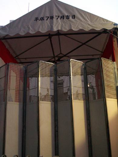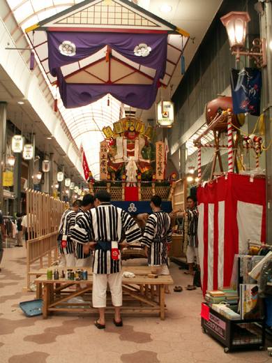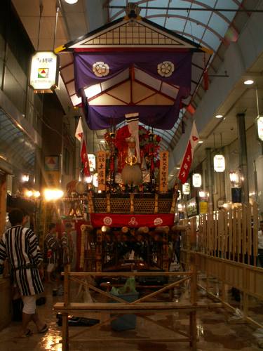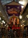 | 今年の見所・・・ * 川端商店街に土居流の山小屋ができたため、 アーケード街で、飾り山、走る飾り山、舁き山を3つ楽しむことができました。 土居流の舁き山は、何時も端に寄っていて堂々と屋根の真下に入っていたのは 追い山の前の晩(14日)だけでした。 * 西流の山小屋は追い山のコースの中にありました。 この山小屋くぐりがまた面白いのです。今年のビューポイントでもありました。 |