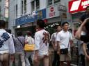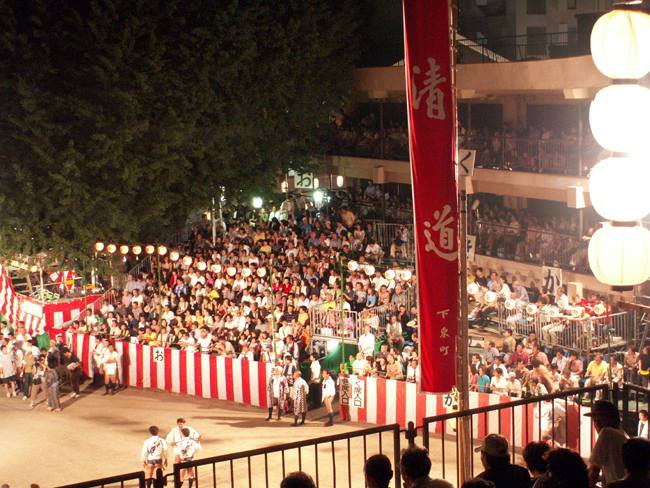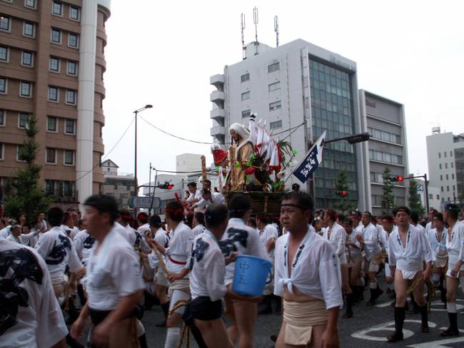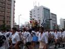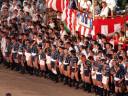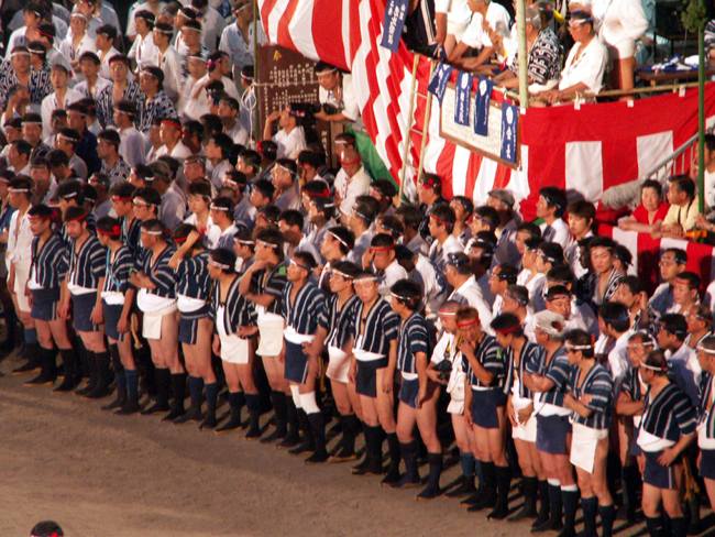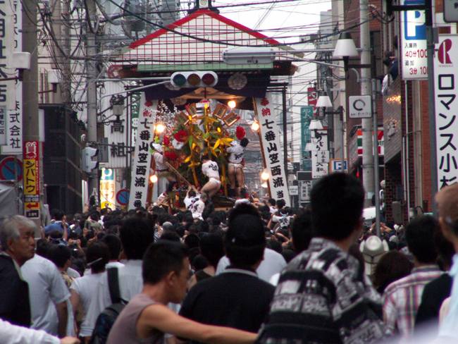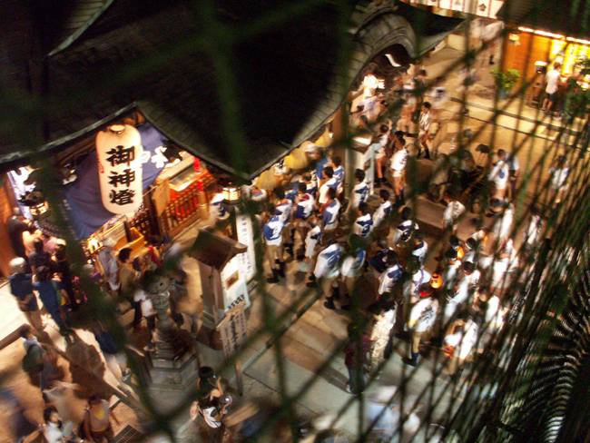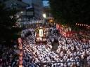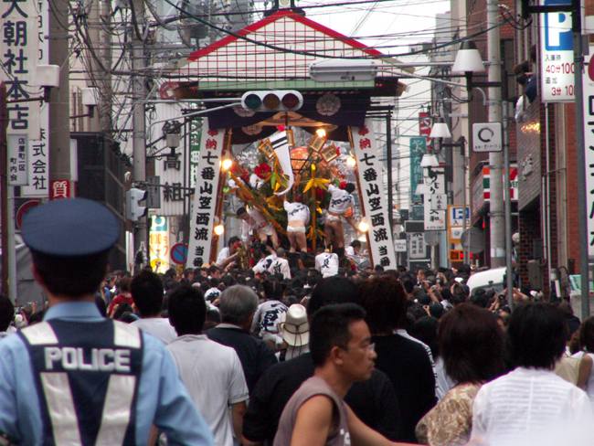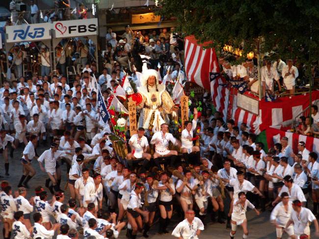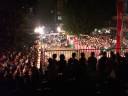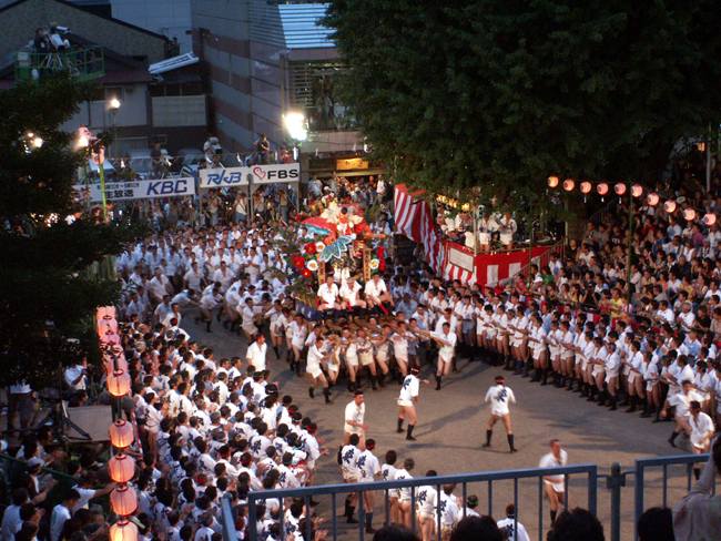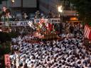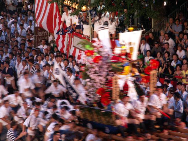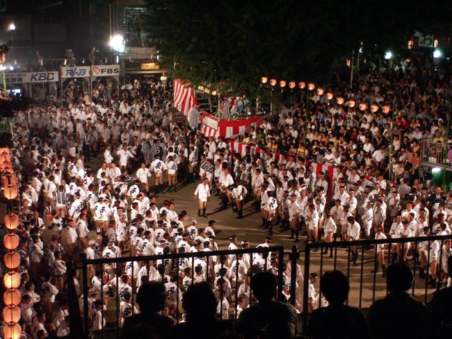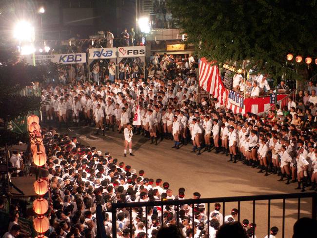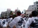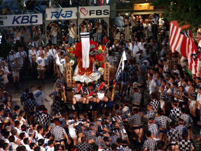 (2005/ 7/15) いよいよクライマックス。 深夜0時ごろ各流に集まり初めその時を待ちます。 一番山のスタートは4時59分。 その後、5時5分から5分おきにスタートします。 今年は、なんと、券を頂き桟敷席で見る事ができました。 3時半に櫛田神社に着いたら既に席はいっぱい。 清道回りが見えませんでしたが、一番上だったので、立って見る事ができて良かったです。