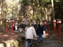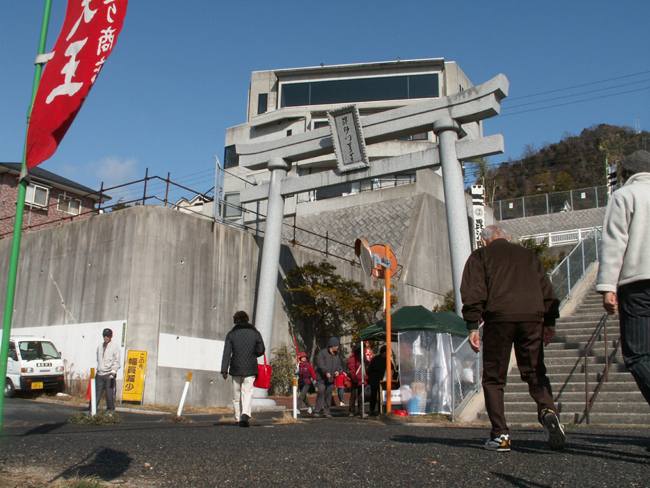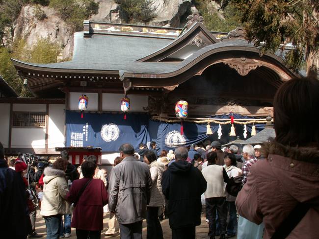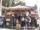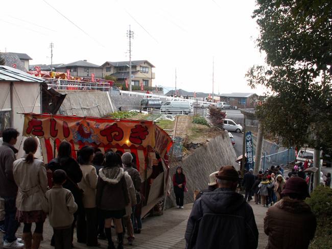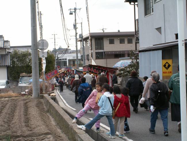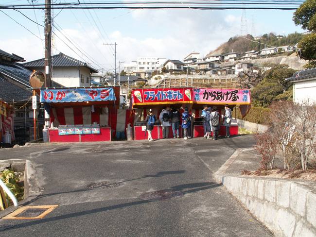 | 近所の子どもたちが、大勢で出店に群がっています。 何十年も前の私の姿と同じ。 昔と違って、ほとんどが食べ物のお店です。 ちょうど(偶然)今年初めてのご開帳の時間と重なっていたため 参道にも、拝殿前にも大勢の人が・・・ 危ないので、あまりカメラを構える事ができませんでした。 |