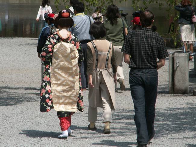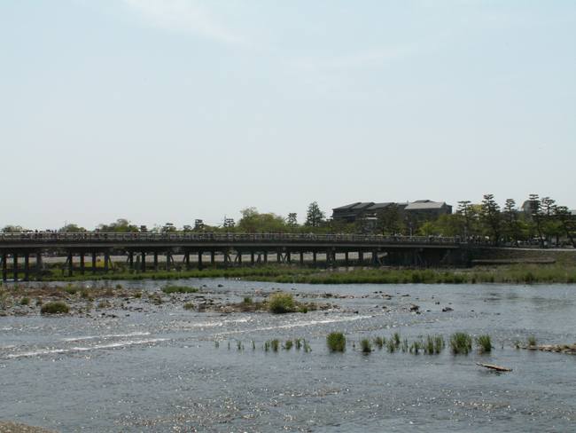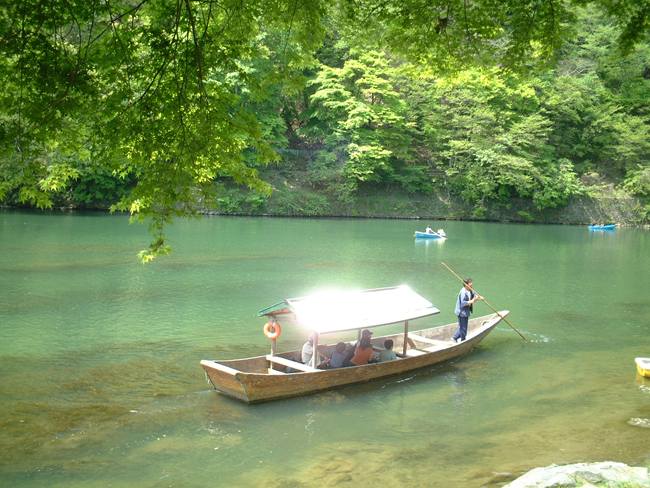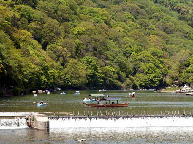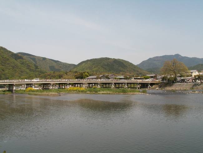 | 嵐山は初めて訪れました2時間ドラマでもお馴染みの渡月橋 お天気も程よくて、屋形船が気持ちよさそう。。。 後姿の舞子さん。。。もちろん観光客ですが、海外から来られた方でした。 |